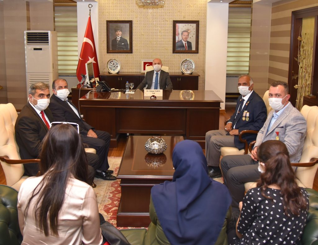 Ağrı Şehit ve Gazi Aileleri Dernek Başkanı Çetin Kaçar ve dernek üyeleri, Doğubayazıt Muharip Gazileri Derneği Başkanı Resul İlhan ve dernek üyeleri; Valimiz Dr. Osman Varol'a hayırlı olsun ziyaretinde bulundular.