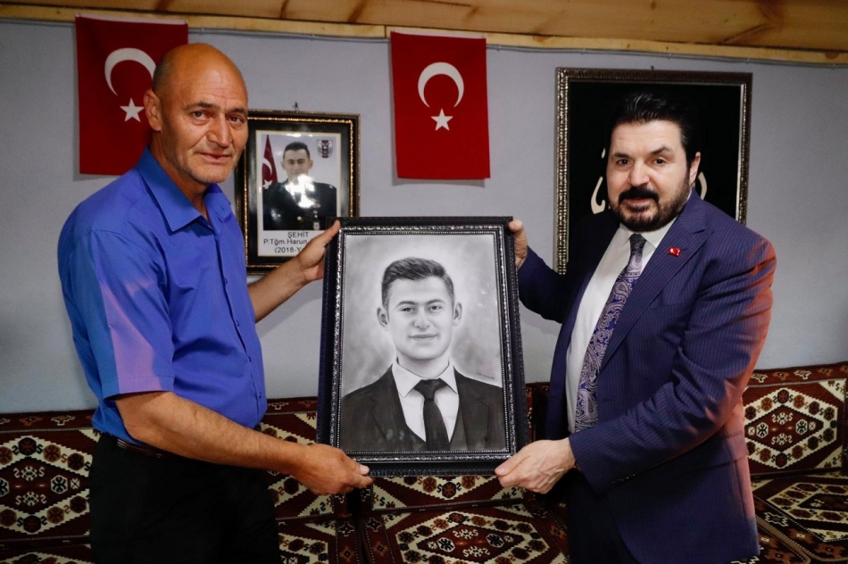 Başkan Sayan, şehit ailemizi ziyareti anısına Piyade Teğmen Harun Aslan’ın kara kalem ile çizilmiş porte fotoğrafını ve Türk bayrağını şehit babası Fuat Aslan’a takdim etti.