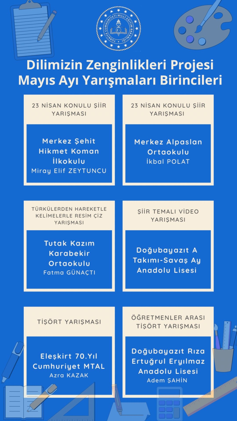 Millî Eğitim Bakanlığı tarafından yürütülen "Dilimizin Zenginlikleri" projesi kapsamında, Ağrı İl Millî Eğitim Müdürlüğü tarafından düzenlenen 2024-2025 eğitim öğretim yılı ikinci dönem sonu yarışmalarının sonuçları açıklandı.