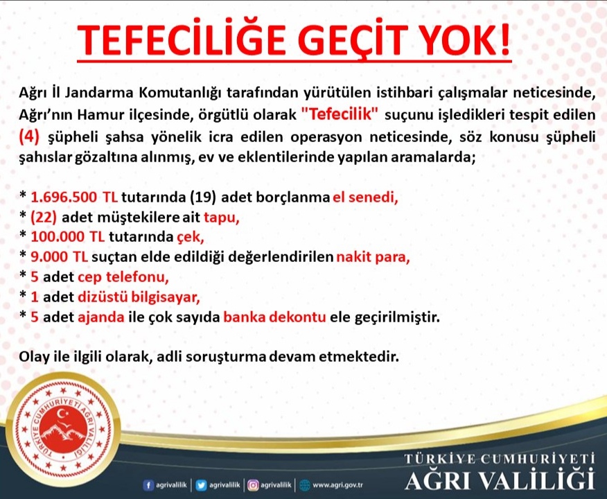 AĞRI VALİLİĞİNDEN TEFECİLERE GEÇİT YOK