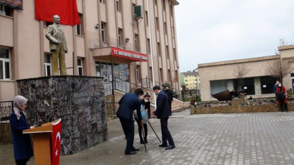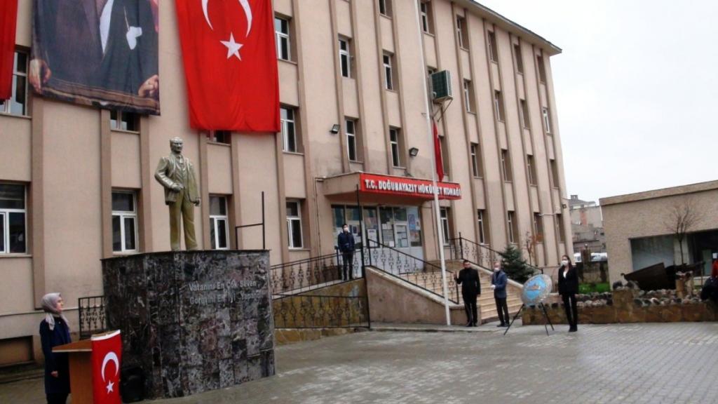 Korona Virüs COVİD 19 salgın hastalık nedeniyle ülke genelinde törenlerin buruk geçtiği 23 Nisan Ulusal Egemenlik ve Çocuk Bayramı Doğubayazıt İlçesinde Atatürk anıtına İlçe Milli Eğitim Müdürü İhsan KÖSEN tarafından çelenk koyma töreni ile yapıldı.