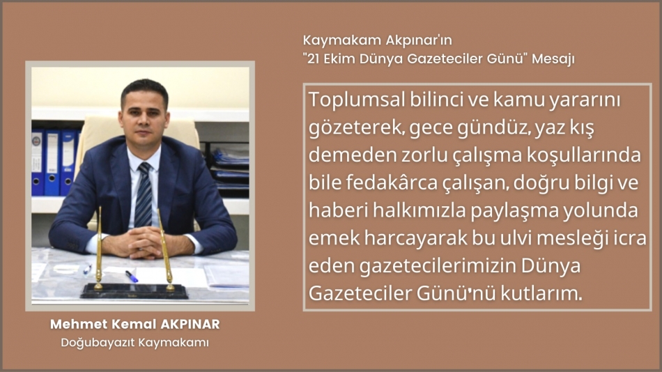 Doğubayazıt İlçe Kaymakamı Mehmet Kemal Akpınar 21 Ekim Dünya Gazeteciler Günü münasebetiyle bir mesaj yayımladı.