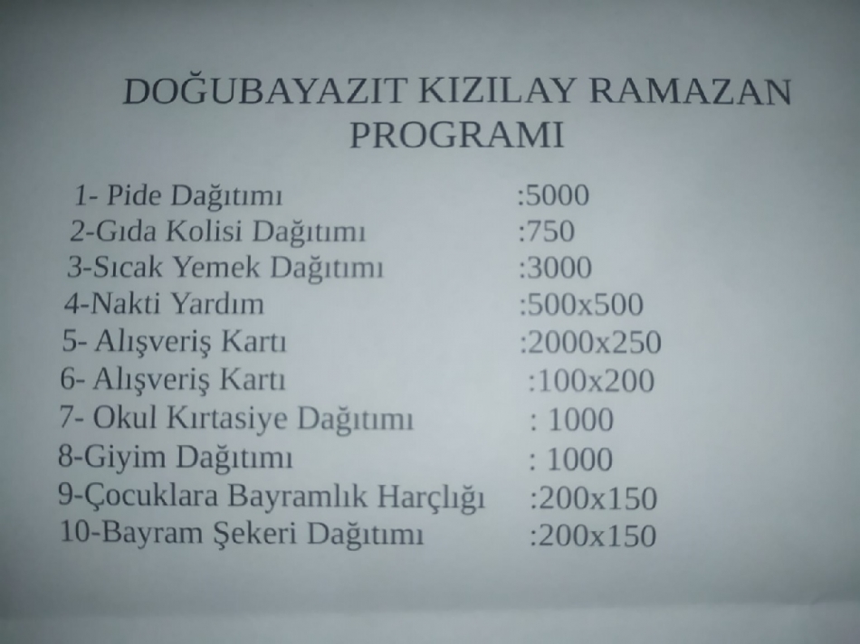 Türk Kızılay Doğubayazıt Şube Başkanı Kemal Şahin yaptığı açıklamasında “Türk Kızılay’ı hayatın her döneminde ihtiyacı olana el uzatan, Kızılay olarak gelenekselleşen Ramazan yardımlarıyla bu yıl da "Ramazan Bereketini Paylaşan Kalplere Hilal Olsun" sloganıyla Doğubayazıt ilçesi ve köylerinde bulunan ihtiyaç sahiplerine ulaşmayı planlıyoruz. Büyük bir iyilik ordusuyla hareket ederek bu Ramazan Ayında yardımlaşma ve dayanışma duygusuna güvenerek yola çıktık. Birliğin, beraberliğin, yardımseverliğin ve hoşgörünün ayı olan Ramazan Ayı tüm İslam alemine hayırlı olsun”. dedi