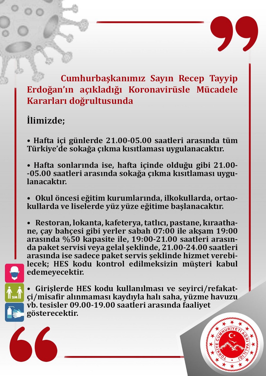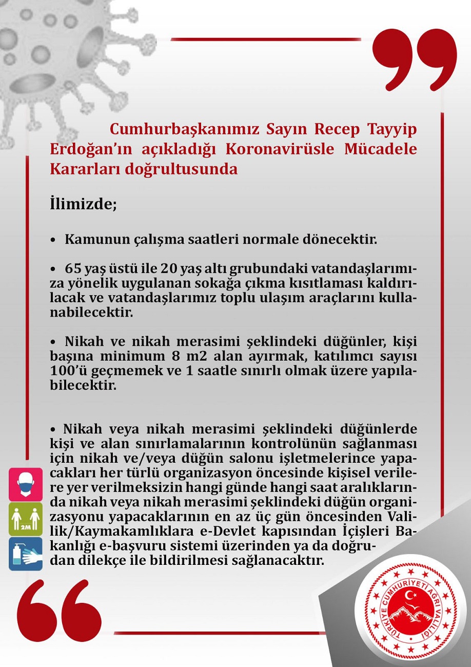 Cumhurbaşkanı Sn Recep Tayyip Erdoğan tarafından günlerdir merakla beklenen kademeli normalleşme kararları açıklandı.