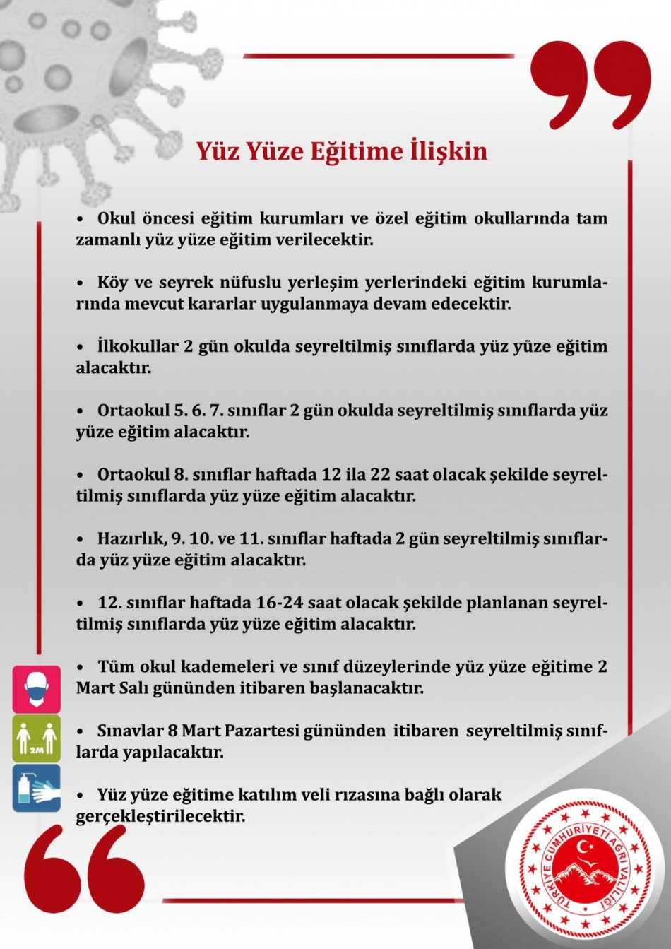 Türkiye'nin tamamında okul öncesi, ilkokul, 8. ve 12. sınıflarda yüz yüze eğitime geçilecek. Düşük ve orta riskli illerde ise ortaokullar ve liselerde yüz yüze eğitim olacak. Yüksek ve çok yüksek riskli illerde, ortaokullar uzaktan eğitime devam edecek; liselerde ise yüz yüze sınavlar yapılabilecek.