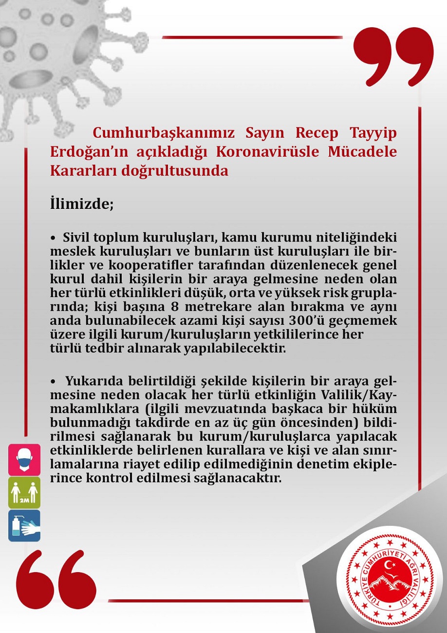 Nikâh ve nikâh merasimi şeklindeki düğünler, düşük ve orta riskli illerimizde 100 kişiyi, yüksek ve çok riskli bölgelerde 50 kişiyi geçmemek ve bir saati aşmamak kaydıyla yapılabilecek. Sivil toplum örgütleri, meslek odaları, kooperatifler ve benzeri kuruluşların genel kurulları; düşük, orta ve yüksek riskli illerde, katılımı 300 kişiyi geçmeyecek şekilde yapılabilecek. Çok yüksek riskli illerde icra edilemeyecek.